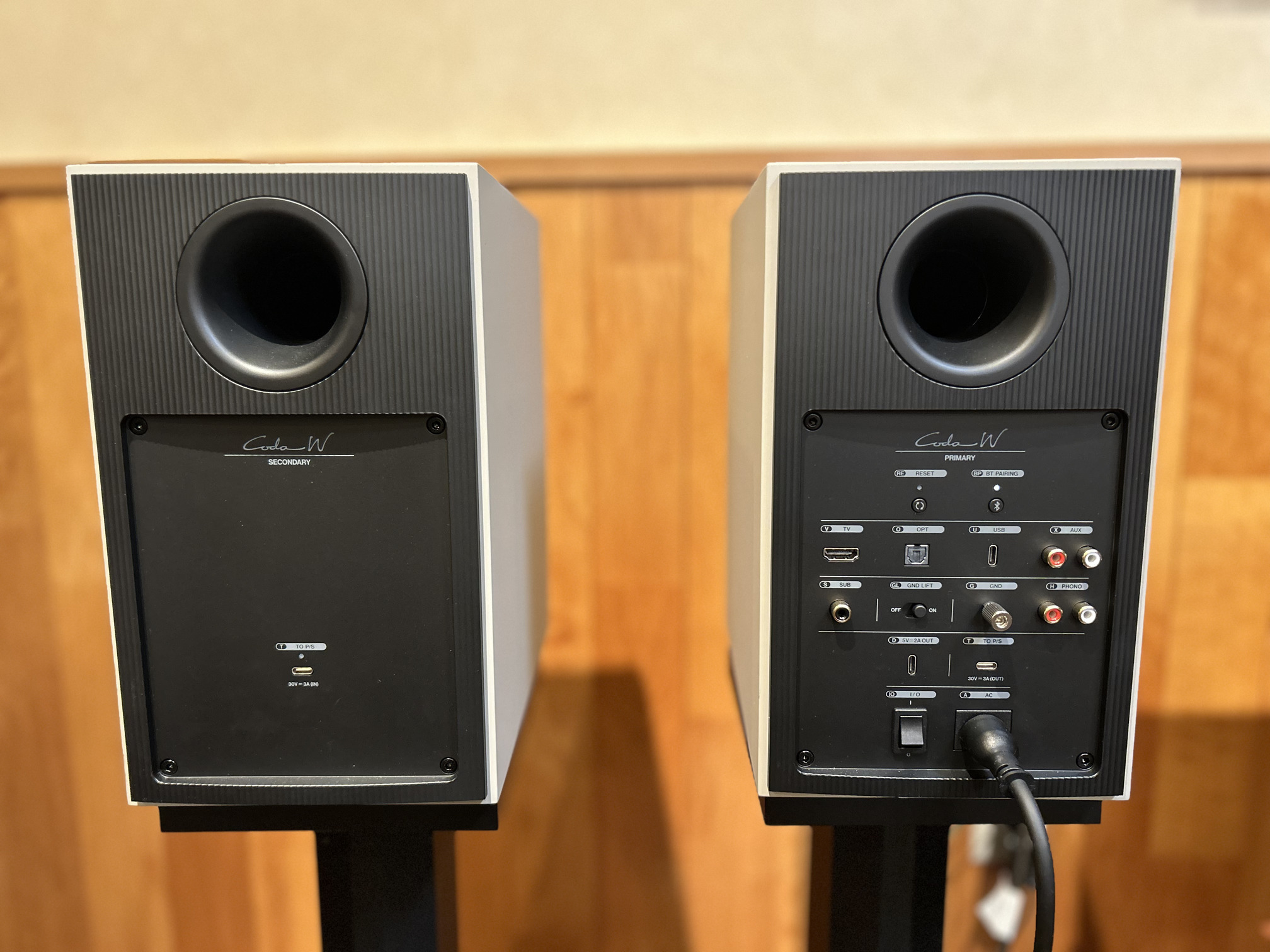 片方がプライマリー、もう片方はセカンダリー形式になっています。スピーカー間は付属のC to Cケーブルで接続します。