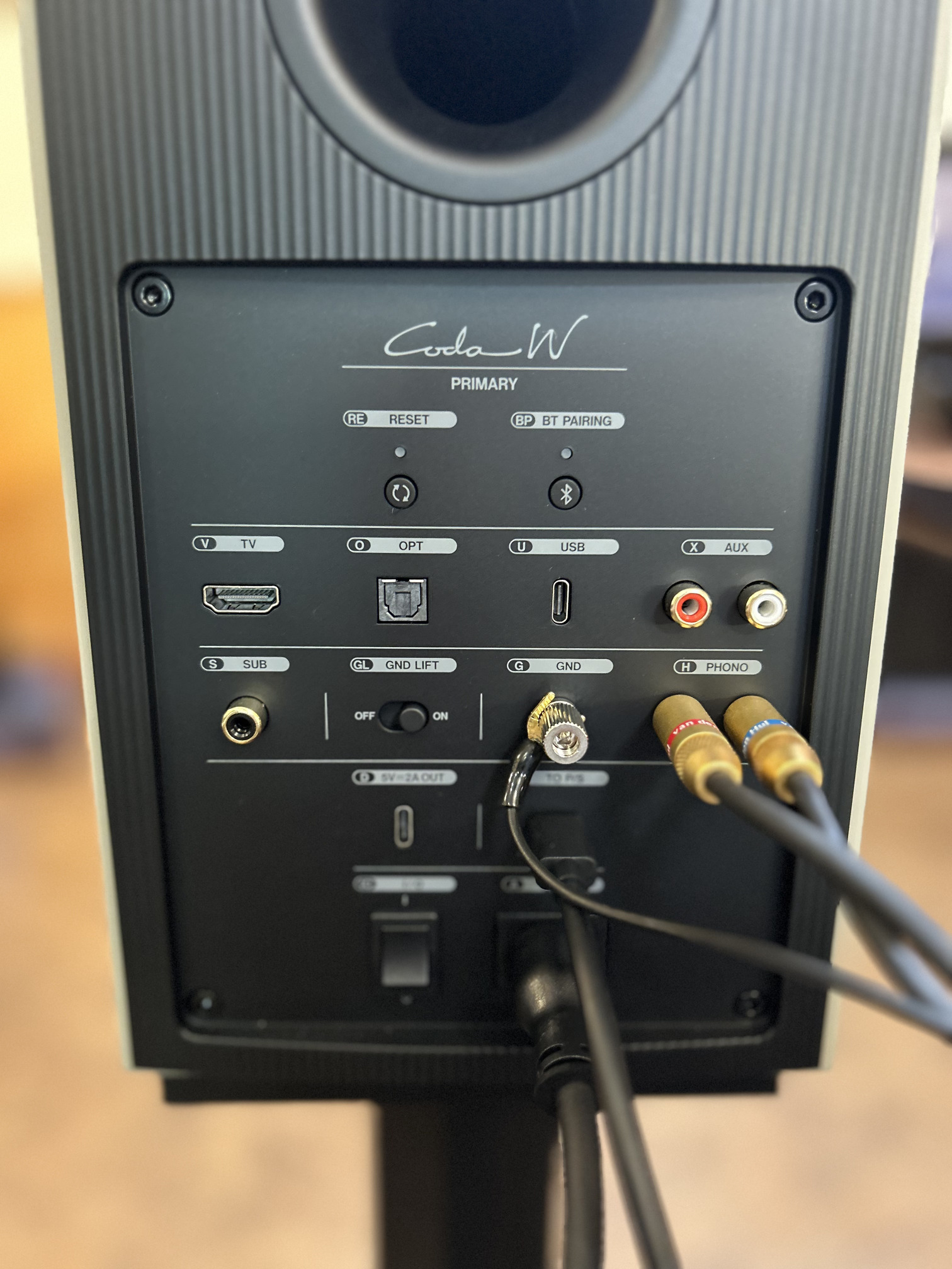 Bluetooth、HDMI ARC、Optical、USB-C、AUX、そして今回の目玉のPhono入力。なんとフォノアンプも搭載しているため、レコードプレーヤーから直でCoda Wへ出力できてしまうというわけです!!今回一番お伝えしたい点はココ。
