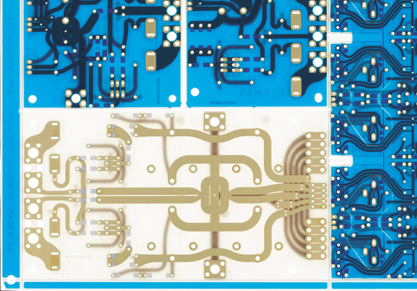 全ての音声信号回路には、金メッキを施した100μm厚の銅箔を使用し、さらに信号ライン上のレジスト層を持たない特殊な構成のピールコート基板を採用しました。レジスト被覆による容量成分の影響を排してパターンインピーダンスを低減し、周波数劣化を最小限に抑えています。そして可能な限り幅を一定に保ち鋭角に曲がらないよう滑らかな曲線を描くラウンド配線パターンによって、微細な音楽信号も滞りなくスムーズに流れるよう細心の注意を払っています。