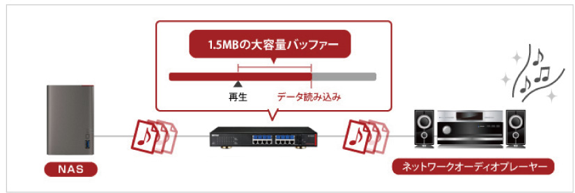 1.5MBの大容量パケットバッファーにより、オーディオ機器へ転送されるデータをスイッチングHubに一時的に保持。