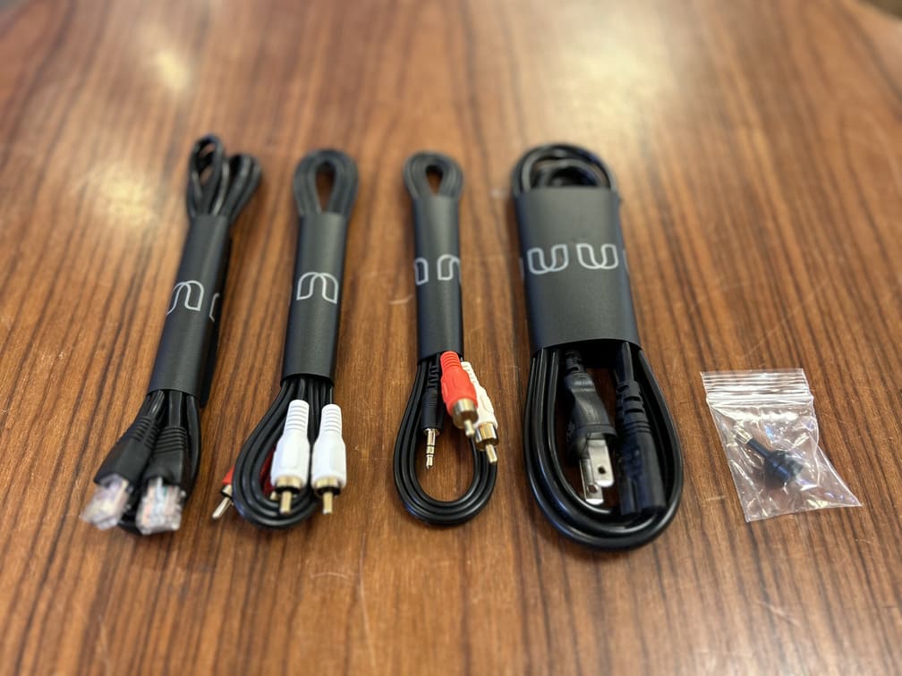 付属品:本体、外箱、RCA-RCAピンケーブル、ステレオミニプラグ-RCAピンケーブル、電源コード、イーサネットケーブル、トスリンク-ミニプラグアダプター