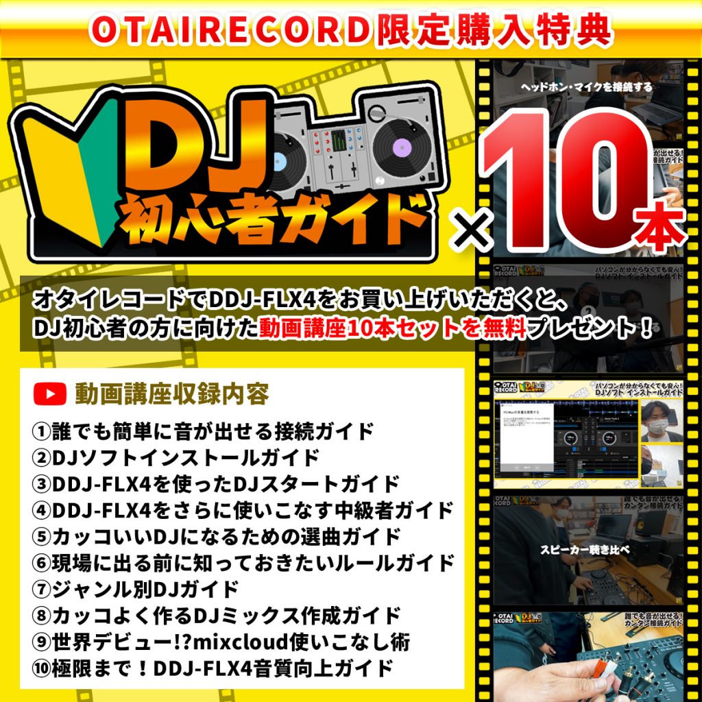 オタレコでDDJ-FLX4を購入すると接続から音出し、ミックステクニックなど知っておきたい情報が全部詰まった動画ガイドを10本無料プレゼント中!