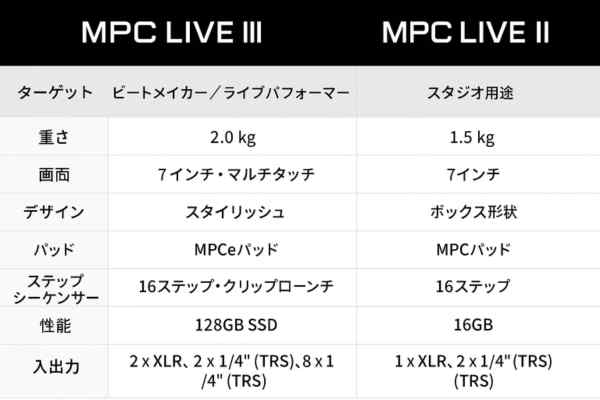 この比較表を見ると、MPC Live IIIが単なるマイナーチェンジではなく、制作環境そのものを進化させた“次世代MPC”であることがわかります。
