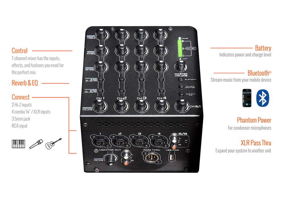 EON ONE PROはモノラル入力×4、ステレオ入力×1の6chミキサーを内蔵。モノラル入力はXLRと標準フォーンに対応し、マイク/ライン・レベルの切り替えや高域/低域のEQ、リバーブ機能が利用できます。さらに、EON ONE PROは48Vファンタム電源の供給が可能で、エレクトリック・ギター/ベース等の楽器を直接接続できるハイ・インピーダンス接続にも対応しています。ステレオ入力は、RCA、ミニフォーンでの接続が可能です。