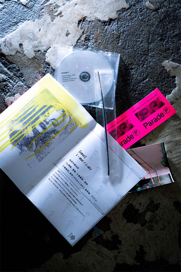 昨年3月以来となる本展では、新たな企画『芸術研究所PARADE』と題し、様々な可能性の模索や社会実験などのプラットフォームを通じた研究発表が約2ヶ月に1回のペースで行われている。『idol』をサブテーマとして制作されたZIN、キャンバス作品、Tシャツは、プリンターでプリントされた肖像をさらにコピーしプリントを繰り返し消えゆく偶像の上にらくがきし、らくがきと消えゆく肖像との関係性の変化やクレシェフ効果などが見られないだろうかと言う発想を元に制作。