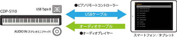 ※ピアノ本体とスマートフォン/タブレットを接続してのスマートフォン/タブレットによる本体機能コントロールには、別売のUSBケーブルなどが必要になります。
