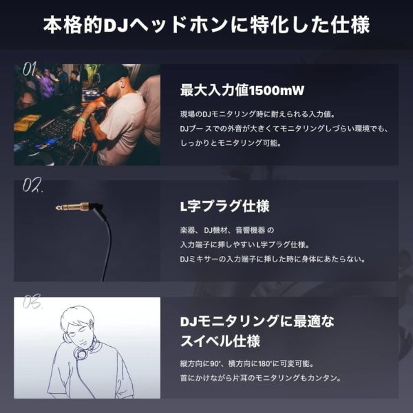 リーズナブルな価格でシンプル定番な雰囲気を醸し出す飽きの来ないクラシカルなデザイン。最大入力値1500mWの仕様によりプロDJの現場に耐え得る入力値を実現しています。おうちパーティーDJにおいてのDJ中、お友達に話しかけられてもモニタリング中のバスドラの音を聞き逃すことはありません。またイヤパッドは前後に90度上下に180度 反転できるスイベル仕様。DJ時、アーム部分を首にかけて片耳だけをストレスなくモニタリングすることができます