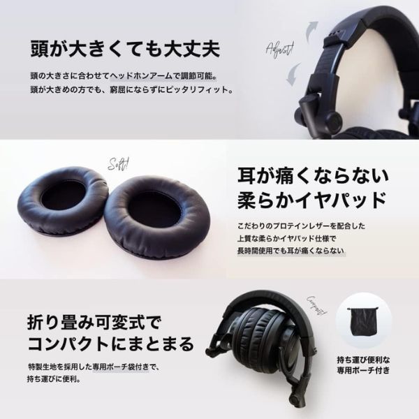 プロテインレザー生地を採用した柔らかイヤパッドは手触り滑らかで両耳へ心地良いフィット感をもたらします。固くない為、長編映画の動画視聴や長時間に渡るオンラインミーティング、長時間のDTM作曲作業の際の負担軽減を実現しています。また本体は折り畳み可能です。着脱式ケーブルをヘッドホン本体から外してコンパクトに折り畳んでREFION特製ポーチ袋に収納可能。置き場所や持ち運びにも困ることはありません。