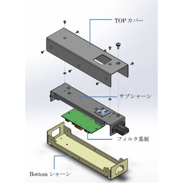 インレット、コンセント、基板に至る全てのパーツをサブシャーシに搭載し、外装ケース(TOPカバー、BOTTOMシャーシ)から独立(宙吊り)させることで、電源タップに影響をおよぼす外部からの不要振動を減衰します。