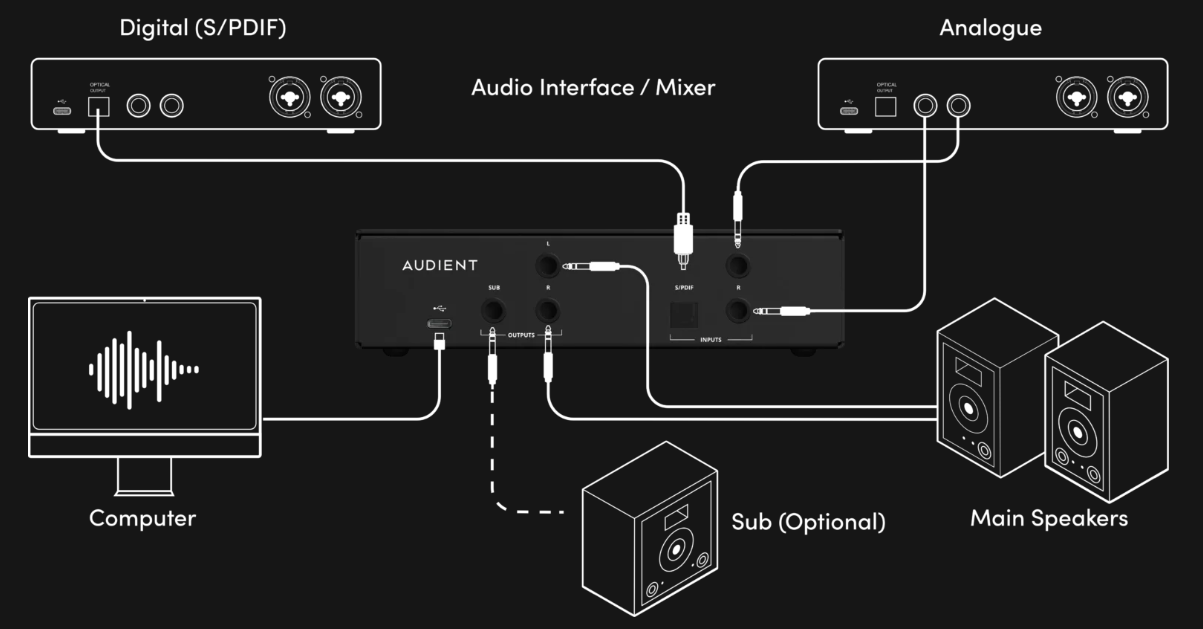 ORIA miniは、Sonarworks SoundID Referenceと連携するルーム補正ハードウェアです。 オーディオインターフェースとモニタースピーカーの間に設置することで、 部屋の音響特性を補正し、より正確なモニタリング環境を実現します。