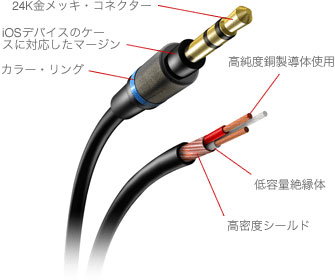 これら高品質な部品を組み合わせることにより、最良な信号伝送を実現したので、高音質で再現性の高い音を出す事ができます。またiLineのコネクター部は、スマートフォンのケースを外さなくてもしっかり接続できるようにデザインされており、その機能が色で一目で分かるようにカラー・リングが付いています。