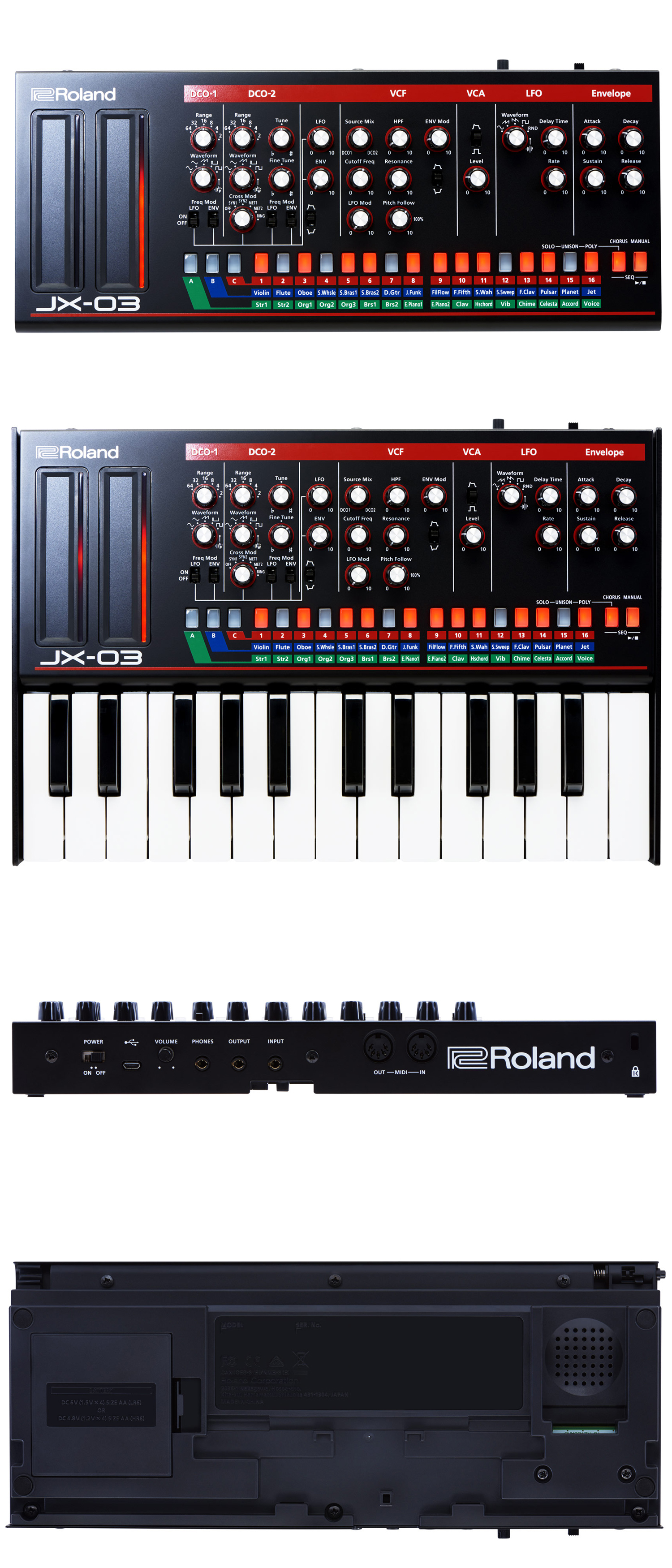 本体のプリセット音色をボタン一つで瞬時に呼び出すことが可能になった黎明期シンセで、その後のシンセサイザーの礎となった名機JX-3Pをモチーフにした数量限定のRoland Boutique JX-03。このJX-03は、JX-3P専用プログラマー PG-200の24個の操作子を装備しており、当時のサウンド・メイキングを体験することができます。また、オリジナルには搭載されていなかった新規波形や、DCOの可変範囲が拡張されるなど、オリジナルを超えるサウンドが手に入ります。オプション・キーボード・ユニットK-25mと接続することで小型キーボード・シンセとしても楽しめます。