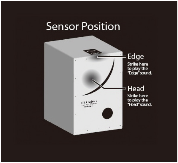 電子レイヤー音を鳴らすための最適な打点位置を示すためのセンサー・ポジション・ラベルを演奏者の目に留まりやすいトップ・パネルに貼付。