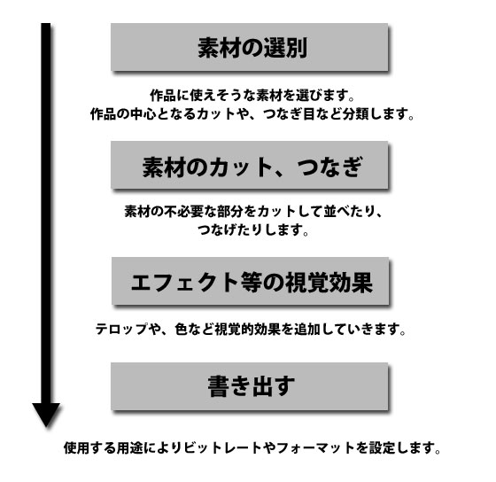 編集作業は映像制作の最終工程です。 ここまで汗水流して挑んできたシュミレーションから撮影まで生かすも殺すも ここで全て決まってしまいます。 この工程で撮影してきた素材から不要な部分、不適切な部分を見つけ作業に反映させます。 全体的にはこのような流れになると思います。